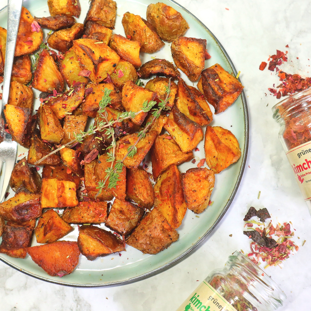 Am besten werden die Kartoffeln natürlich heiß serviert. ;) Für den extra Geschmack haben wir noch Kimchi-Streusel Grillgut und Grüne Vielfalt on top gestreuselt. Lecker!
