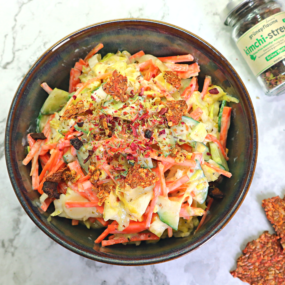 Unsere Bio Kimchi-Streusel in der Sorte Grüne Vielfalt pimpen den Salat nochmal mit aromatischen Kräutern auf. Für den extra Crunch sind unsere Krimchi's zerkleinert und über den Salat gestreut. Yummi!