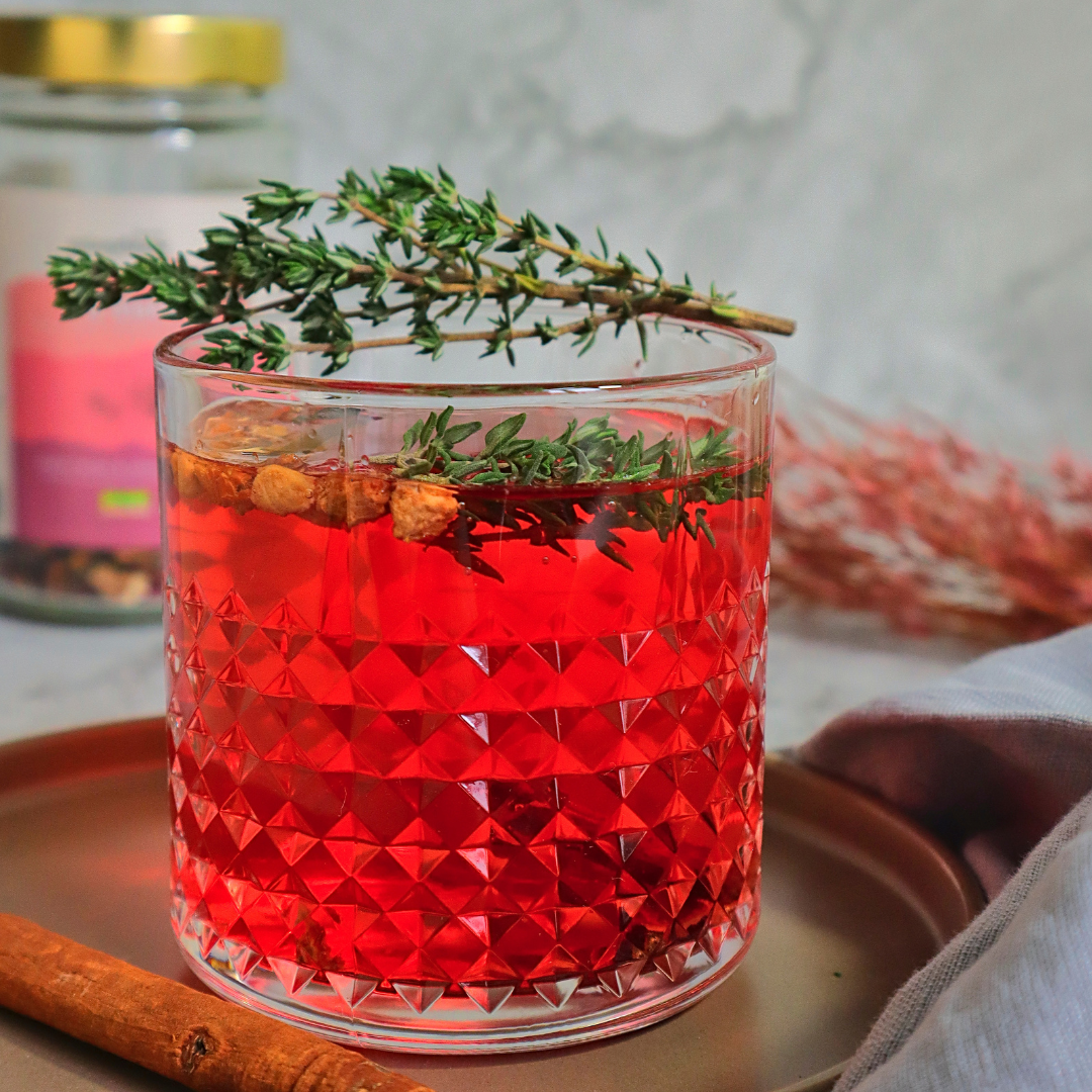 Stell dir vor, du setzt dich nach einem stressigen Tag in deinen gemütlichen Lieblingssessel oder in den winterlichen Garten, gießt dir diesen Coldbrew-Eistee ein und lässt dich von den Aromen von Zimt und fruchtigen Erdbeeren verzaubern. Die Zimtstange bringt eine warme, wohltuende Würze in den Eistee, die perfekt in die winterliche und weihnachtliche Stimmung passt, während die fruchtigen Noten von Erdbeere und Himbeere für eine spritzige Frische sorgen. Zimt ist nicht nur geschmacklich ein Highlight, sondern auch bekannt für seine entzündungshemmenden Eigenschaften – ideal für jede Jahreszeit. Der Thymian fügt eine subtile, kräutrige Note hinzu und wirkt beruhigend. Optional kannst du noch eine Teemischung deiner Wahl hinzufügen, um den Eistee nach deinem Geschmack zu verfeinern.