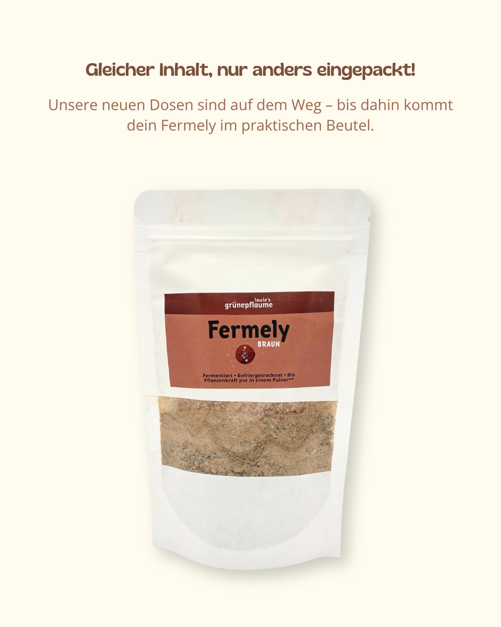 Fermely BRAUN vereint ausgewählte naturbraune Zutaten in einem natürlichen, fermentierten Mix – ganz ohne Zusätze. Durch die Fermentation und Gefriertrocknung bleiben Aromen und wertvolle Pflanzenstoffe bestmöglich erhalten. Ideal für alle, die unkompliziert mehr Vielfalt in ihre Ernährung bringen möchten.