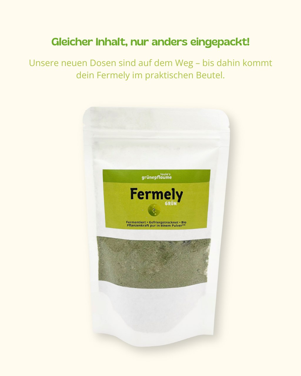 Fermely GRÜN ist eine pflanzliche Pulvermischung aus fermentierten und gefriergetrockneten Bio-Zutaten wie Minze, Zitrone, Spinat, Brennnessel und Birne. Der Mix steht für Frische, Ausgleich und natürliche Vielfalt – ideal für deinen Wochenstart oder wann immer du grün durchatmen möchtest. Dank der praktischen Pulverform lässt sich Fermely GRÜN ganz einfach mitnehmen – ob ins Büro, ins Studio oder auf Reisen.