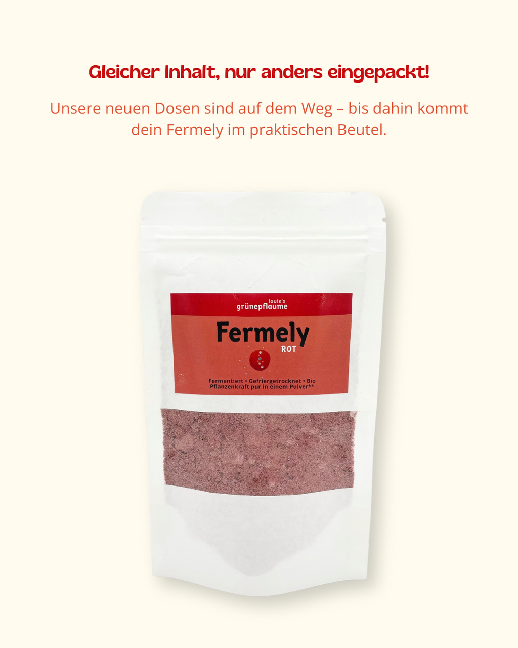Fermely ROT ist eine pflanzliche Pulvermischung aus fermentierten und gefriergetrockneten Bio-Zutaten wie Erdbeere, Rote Beete, Hagebutte, rote Johannisbeere und Aroniabeere. Der Mix steht für frische Fruchtigkeit, innere Balance und natürliche Kraft – perfekt für deinen Start in den Tag oder immer dann, wenn du dir einen belebenden Energie-Boost gönnen möchtest. Dank der praktischen Pulverform lässt sich Fermely ROT ganz einfach mitnehmen – ob ins Büro, ins Studio oder auf Reisen.