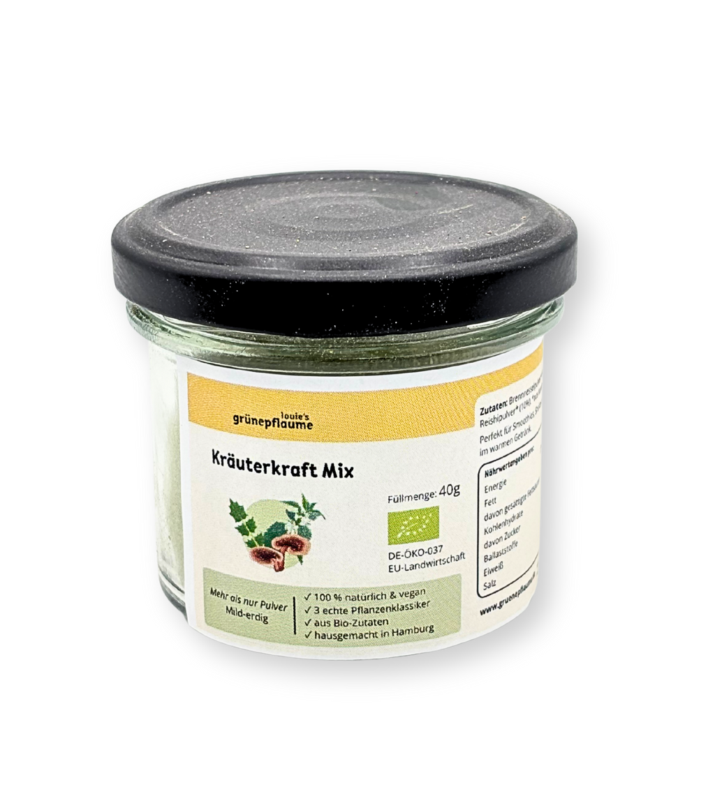 Kräuterkraft Mix kombiniert drei natürliche Klassiker: Brennnessel, Mariendistel und Reishi. Grün, erdig und unverfälscht – ein Pulver, das die Vielfalt der Pflanzen in ihrer reinsten Form vereint.